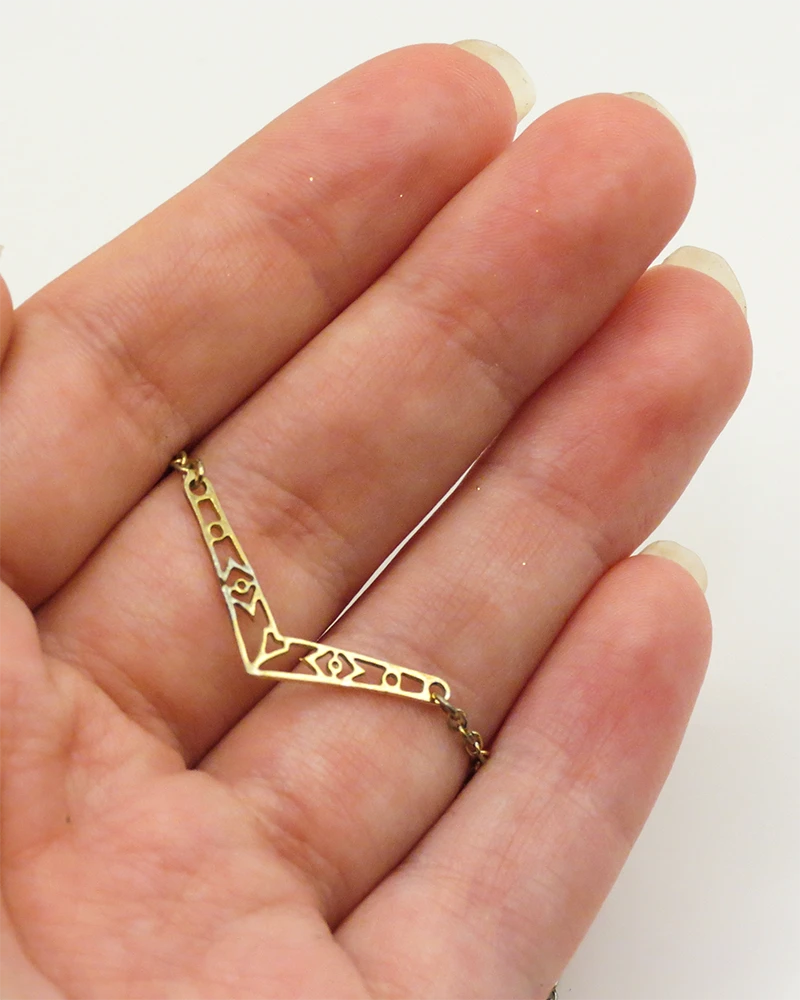 This dainty gold necklace features a refined V-shaped pendant with soft filigree detailing, creating a silhouette that sits beautifully along the collarbone. The openwork design adds subtle texture without overwhelming the neckline, making it ideal for layering yet striking enough to stand on its own. Its understated geometry and fine linework give it both vintage charm and modern minimalism, offering the kind of everyday elegance that feels effortless rather than curated.
