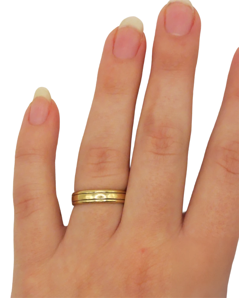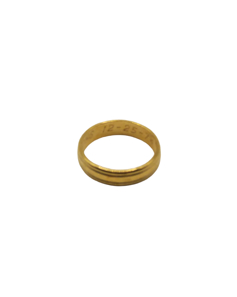 This 24kt gold wedding-style band is a beautifully simple piece featuring two engraved lines along the top and bottom edges. Its clean design and warm gold tone give it a timeless, understated elegance. The ring’s smooth finish and classic silhouette reflect the style of the era in which it was created, making it a quietly sophisticated addition to my collection.