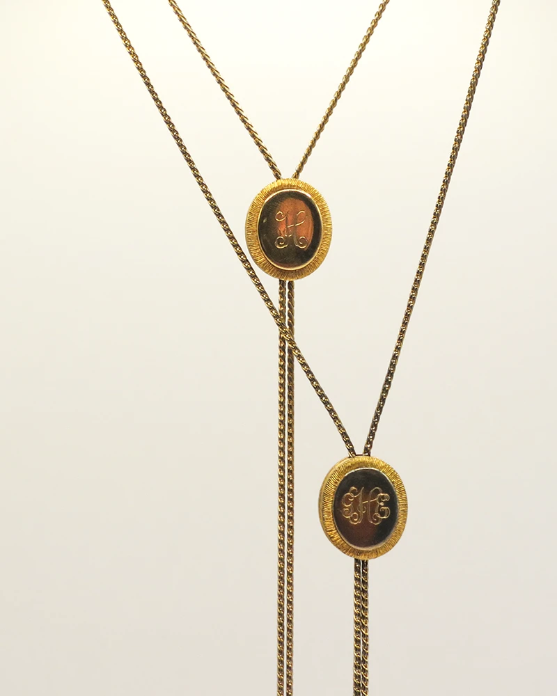 This set of two bolo-style necklaces centers on the engraved “H”, representing the family name Hungate. Each pendant is oval in form, framed in warm gold with subtle rope-textured edges, creating a classic Western-meets-heirloom aesthetic. The adjustable chain design offers styling versatility: worn long, cinched short, layered together, or individually. Though reminiscent of traditional bolo ties, the pieces read softer, less ranch and more refined heritage, making them wearable both casually and in elevated settings.