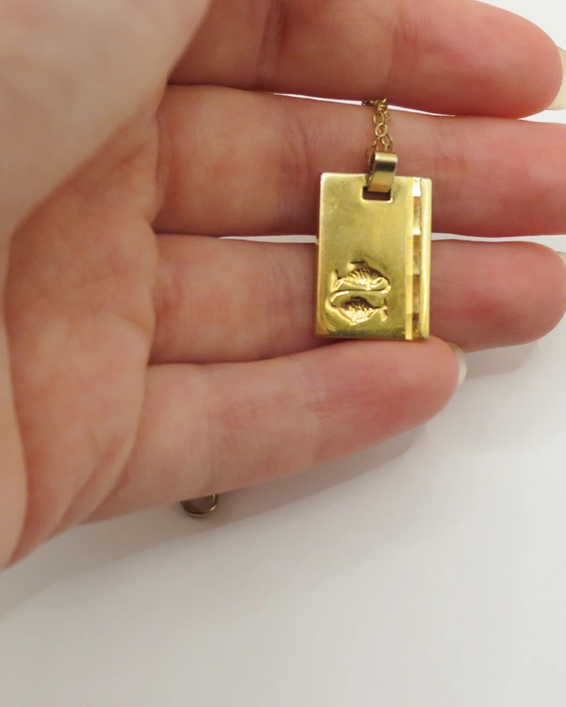 This gold pendant features the Pisces symbol in low relief, framed within a rectangular plaque that gives it a modern, almost talismanic feel. Its clean lines and smooth surface allow the double-fish motif to sit subtly rather than boldly, making it wearable year-round rather than tied only to zodiac occasions. Suspended from a warm gold chain, the piece feels both personal and versatile, chic enough for layered styling, simple enough to wear on its own.