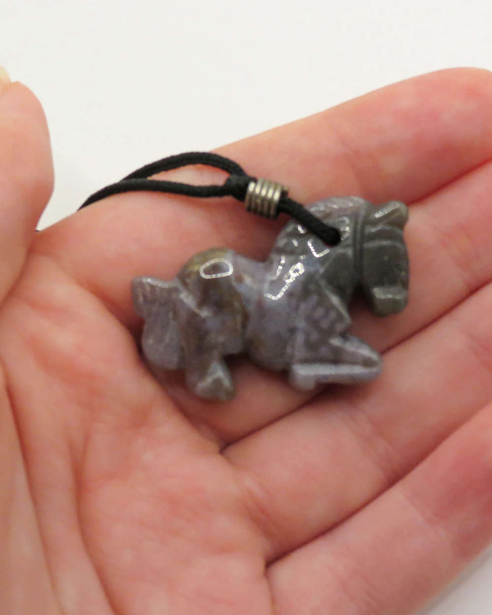 This necklace features a small carved stone horse suspended from a simple cord, capturing youthful whimsy in a quietly sculptural form. The soft grey stone holds subtle depth, with natural tonal variations that shift from lilac undertones to muted earthy hues. Light in weight and casual in style, it carries the handmade charm of artisan craft rather than fine jewelry, making it easy to pair with everyday outfits or keep as a display piece in a curated collection. Purchased at a craft fair when I was young, it remains one of the earliest additions to my jewelry collection.