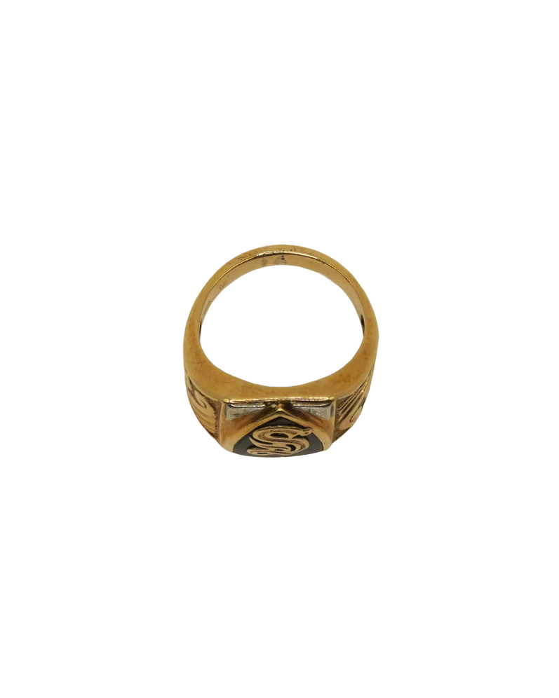 This vintage gold signet ring features an engraved “S” crest set against a deep black enamel backdrop, framed by geometric detailing and subtle diamond-shaped accents. The bold face and substantial weight give it the presence expected of a heritage signet, yet the scroll-style engraving softens the look with refinement rather than austerity. Its textured shoulders and warm gold finish contribute to a sense of history, an unmistakable piece once meant to represent lineage, identity, and belonging.