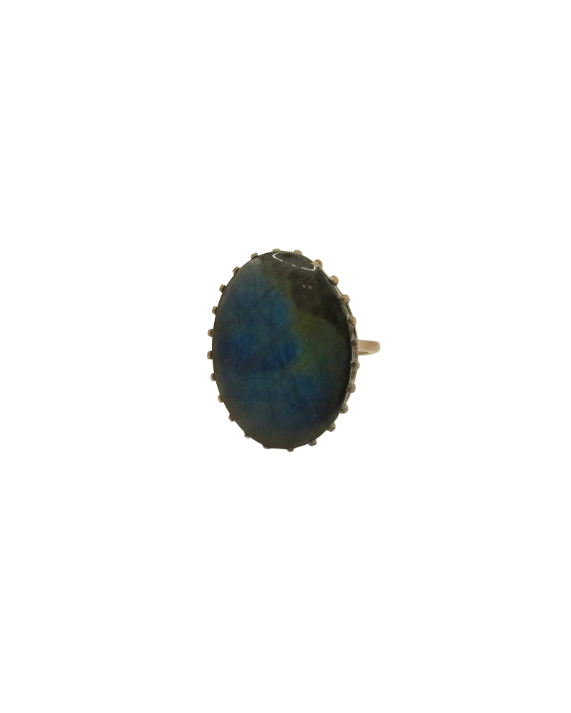 This ring features a large labradorite stone set in a simple silver band, creating a striking statement piece with a captivating, colorful reflective surface. The natural flashes of blue, green, red, and gold within the labradorite catch the light beautifully, giving the ring a dynamic, almost iridescent quality. Even with its substantial size and presence, the neutral tones of both the stone and the silver setting make it surprisingly wearable for everyday use.