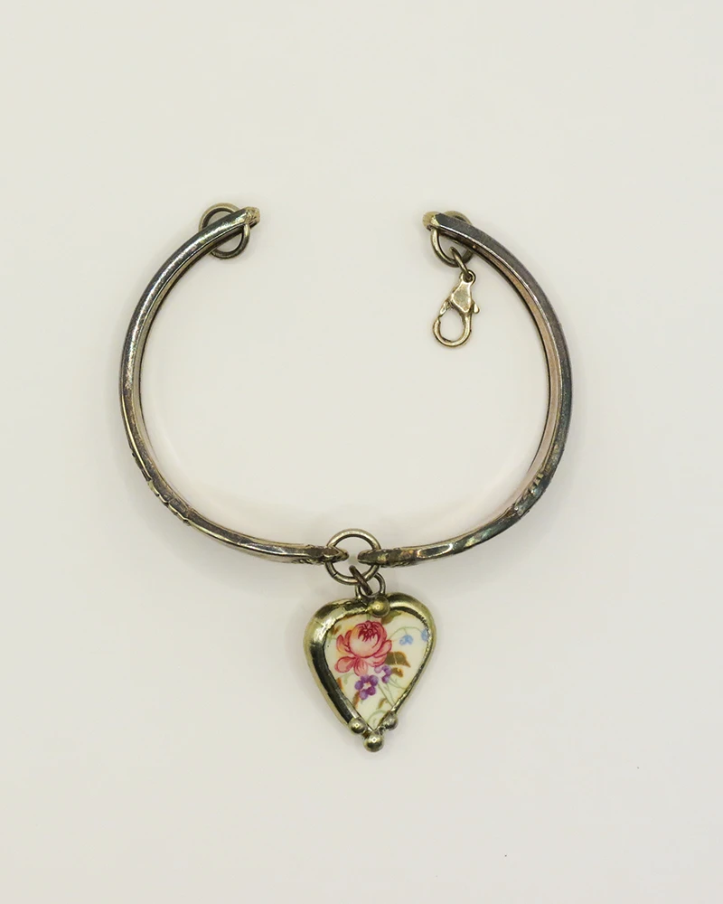 This bracelet transforms pieces of my great-grandmother’s silverware into curved cuff ends, paired with a heart-shaped charm cut from her floral china set. The result is a meaningful fusion of two domestic heirlooms, a dining table and a display cabinet, reimagined as a wearable keepsake. The silverwork on each side retains its original patterning and patina, grounding the piece in history, while the porcelain heart brings softness and color: hand-painted roses and small blooms preserved beneath glassy glaze. It feels both antique and newly alive.